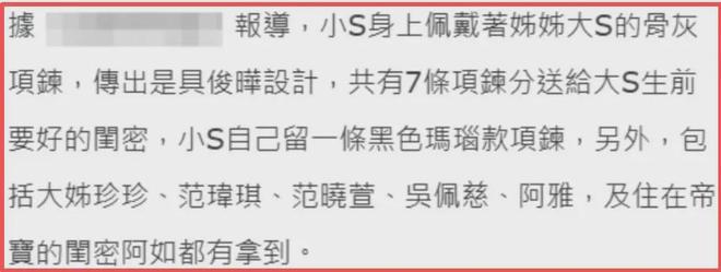 小S自己有一条,大姐徐熙娴有一条,剩下的五条分别给了大S的闺蜜范玮琪、范晓萱、吴佩慈、阿雅、阿如。