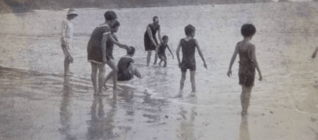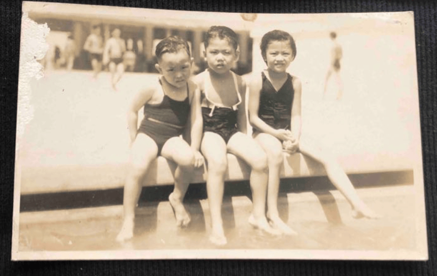 此外,还有一张民国时期的儿童泳装照。三个小孩穿着泳衣,笑容天真,虽然她们年纪尚小,但能够穿着泳装游泳的家庭,肯定是富贵人家。