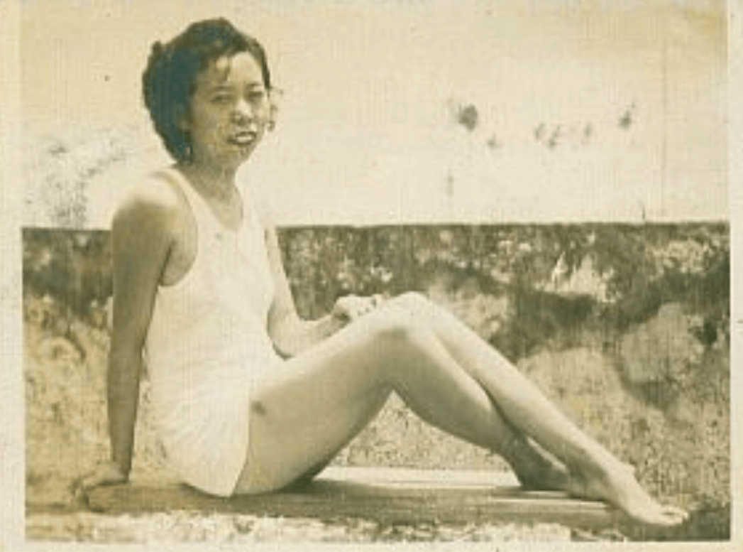 这张照片拍摄于民国时期,镜头中是一位年轻的女孩,她穿着泳装,站在楼梯上,目光轻轻投向镜头,神态矜持,给人一种清新纯净的感觉。