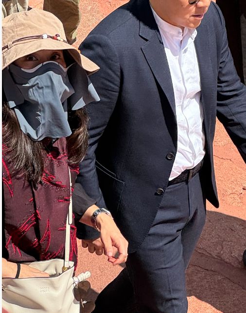 旁边的郭晶晶防晒十分到位,戴着遮阳帽和口罩,穿着长袖很怕被晒到,她包裹的太严实,以至于第一张照片根本看不出她到底长什么样,只能看到一双眼睛。