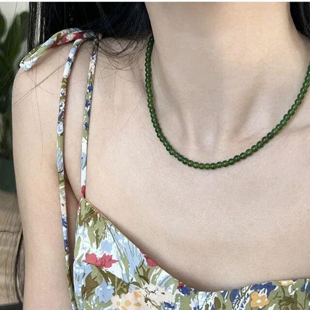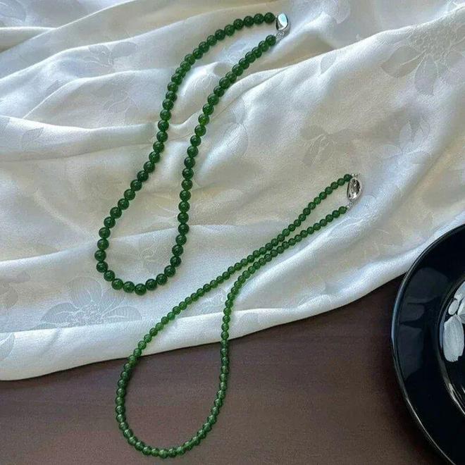 项链整体选用的是深邃浓郁的祖母绿色玉髓,色泽相当饱满,能瞬间衬托肤色,显白提气。