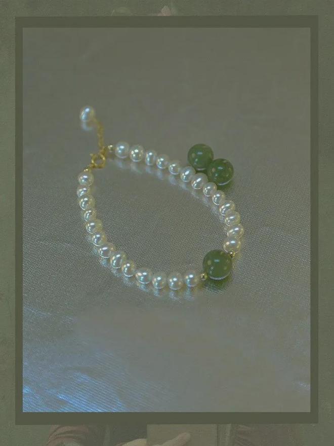 翠绿的玉珠就刚刚好在举手投足之间,似有似无,被白色珍珠簇拥着,带着些许少女的羞涩感。